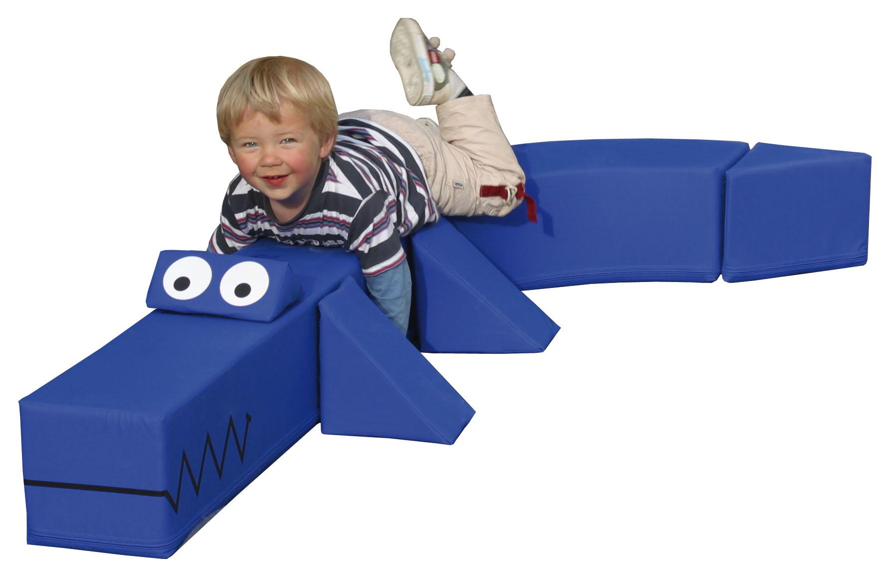 Karlchen das Krokodil gehört zu den beliebten Spielfiguren aus Schaumstoff  in Kindergärten und großen Spielräumen.