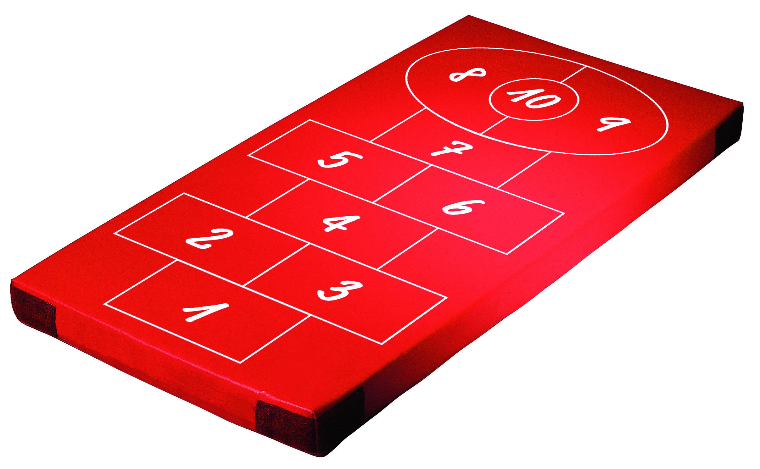 Kennen Sie das? Es regnet und die Kinder wollen unbedingt mit Straßenkreide malen und spielen. Zum Beispiel Hüpfekästchen. Dieses Spiel lässt sich jetzt ohne weiteres auch im Haus spielen. Und dazu ist es noch sicher. Denn der Aufdruck ist auf einer Turnmatte. So gibt es keine Verletzungsgefahr bei Stürzen.
