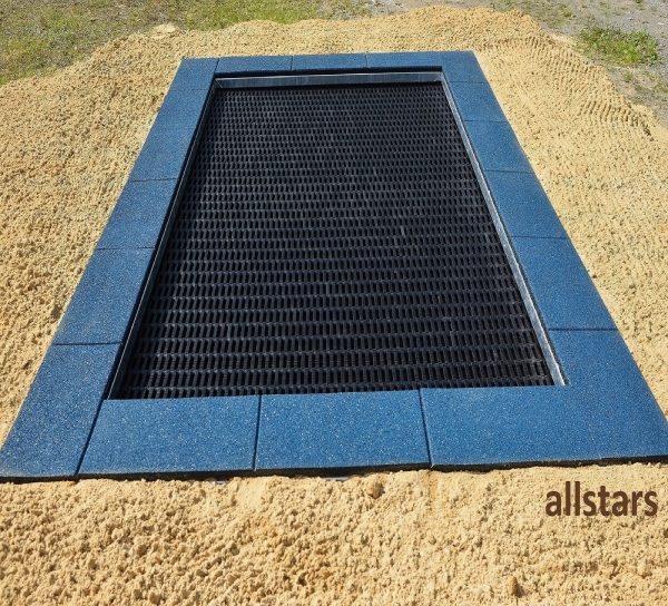* Einbau-Rahmen: Stahlblech feuerverzinkt, komplett vormontiert, oben mit Fallschutzplatten, nach DIN EN 1177 ausgerüstet