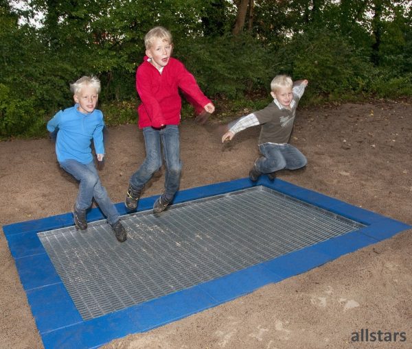 Das Einbau-Trampolin Jump XL ist von hoher Qualität, nahezu unverwüstlich und extrem witterungsbeständig. Es gehört zu den stabilsten Outdoor-Trampolinen, die es zur Zeit am Markt gibt. Die geriffelten Kunststoff- Lamellen sind äußerst robust. Die Sprungmatte zum Einbau in dafür geeignete Einbaurahmen – die Einbau-Rahmen sind Gegenstand dieses Angebotes – sind insbesondere konstruiert für öffentliche Spielplätze. Es ist auch möglich die Sprungmatten ohne Einbaurahmen einzumauern. Eine farbige Fallschutzmatte bildet den Abschluss dieses Trampolins.